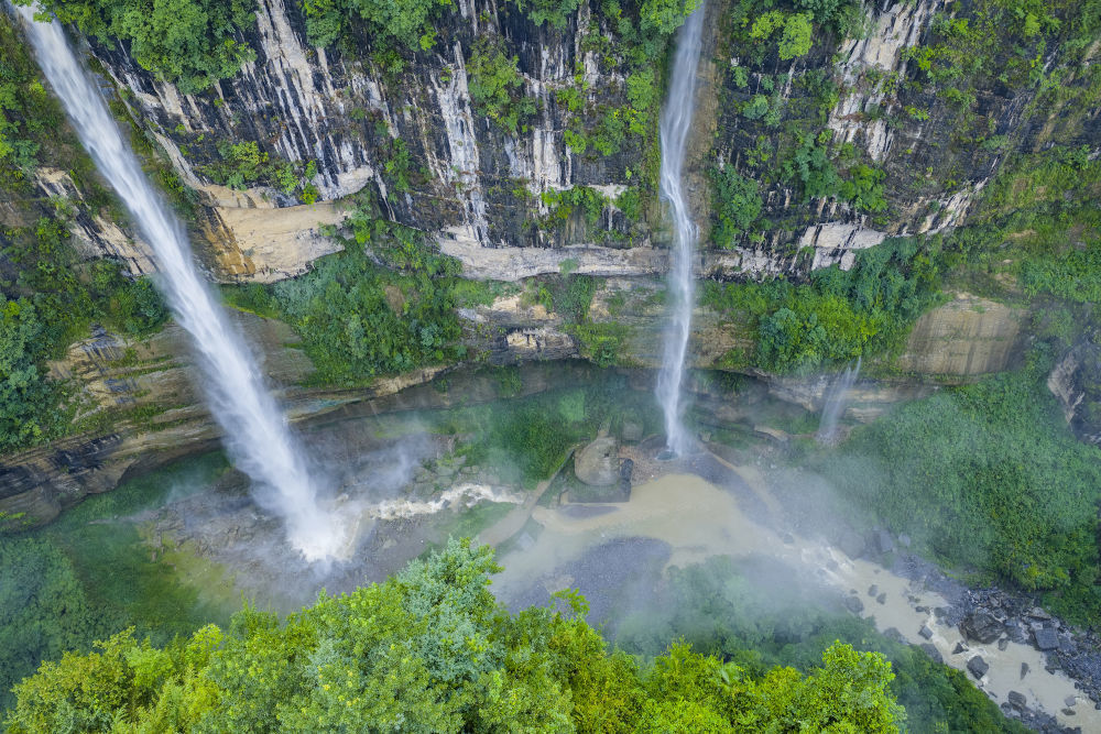 ↑2025年8月11日拍摄的恩施大峡谷雨后瀑布景观。(无人机照片)CICPHOTO/杜维 摄