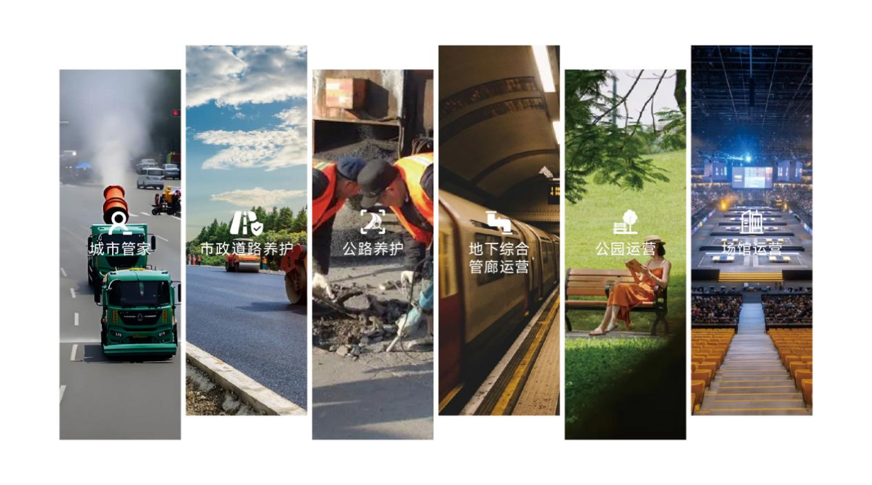 城市服务领域,涵盖城市管家、市政道路养护、公路养护、地下综合管廊运营、公园运营、场馆运营等多种服务类型,结合智慧化平台实现城市综合运营。目前在运营项目包含成都大众配套园城市管家项目、乐山苏稽新区市政项目及省道215线及308改线工程项目、银川地下综合管廊运营、遂宁公园运营项目、北京冬奥会场馆运营项目等,用专业服务提升城市治理现代化水平。