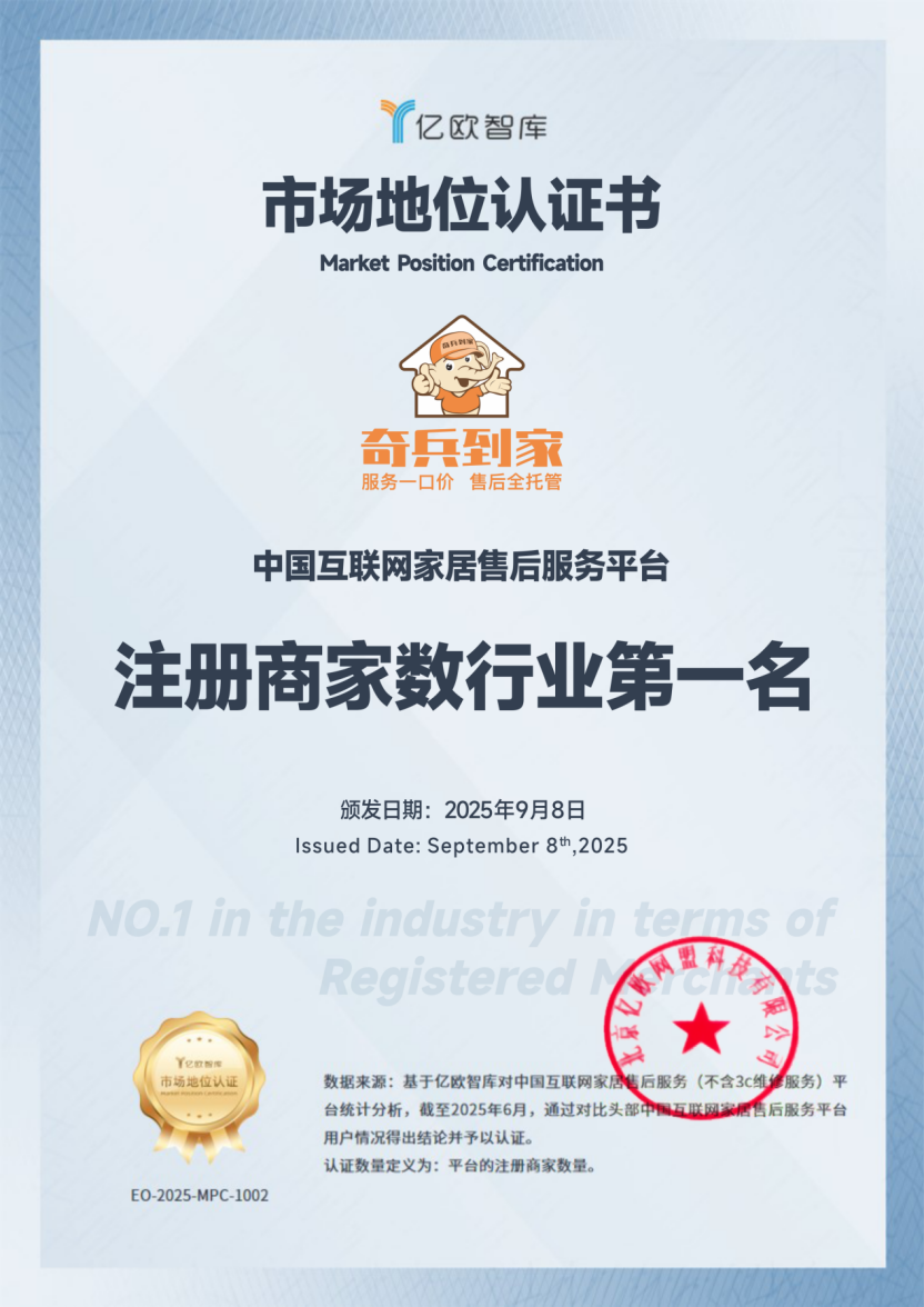9月8日,奇兵到家以平台注册商家数量突破350万的显著优势,获得亿欧智库授予的“中国互联网家居售后服务平台注册商家数行业第一名”认证。亿欧智库是国内TMT与消费领域的权威研究机构,其认证是通过“大数据挖掘+研究分析”双模型综合研判,并对中国互联网家居售后服务行业进行了系统研究而最终确认。