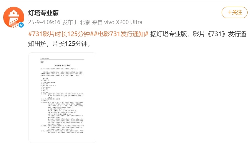 据灯塔专业版,影片《731》发行通知出炉,片长125分钟。