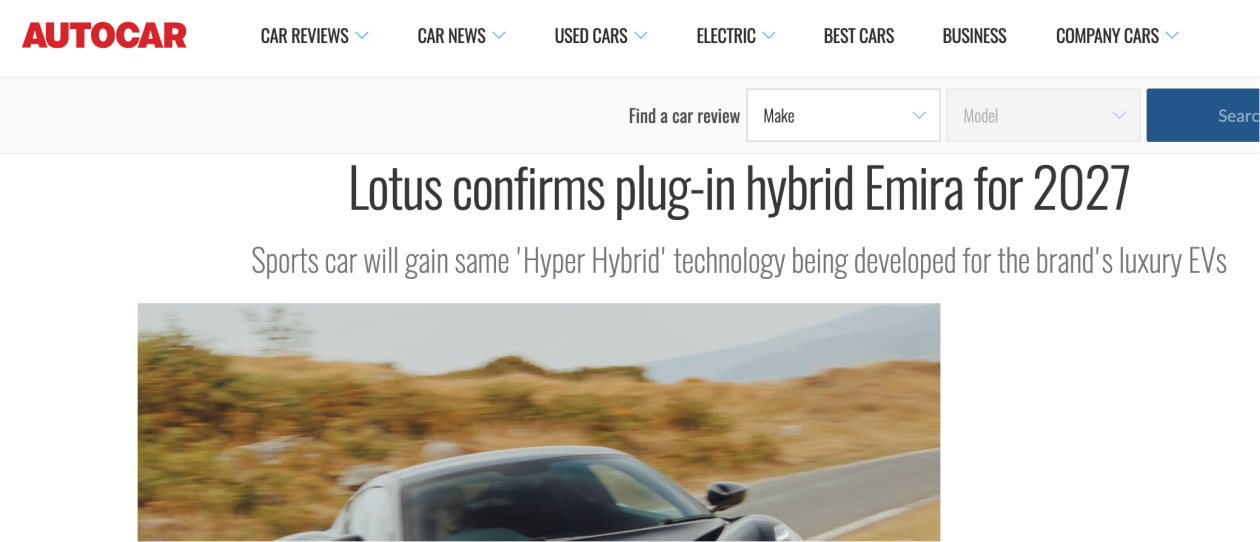 【环球网科技综合报道】8月30日消息,据外媒Autocar 报道,英国跑车制造商莲花汽车(Lotus)确认,将推出旗下热门车型Emira的插电式混合动力(PHEV)版本,并对现有V6发动机车型进行技术升级,以应对欧盟即将于2027年全面实施的欧7排放法规。