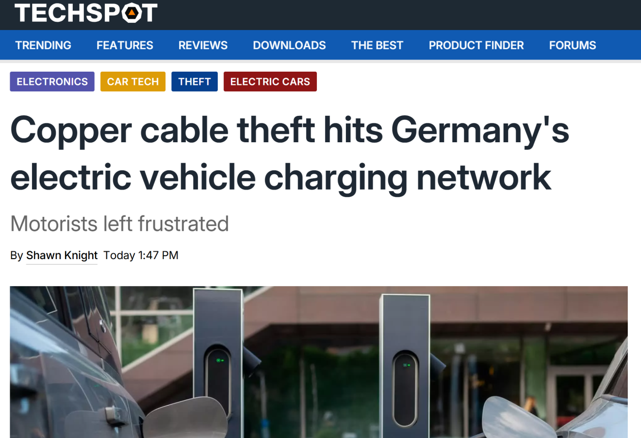【环球网科技综合报道】9月4日消息,据海外科技媒体TechSpot报道,德国电动汽车充电领域近期正面临严峻的电缆盗窃难题,这一问题已对当地充电网络正常运转造成严重冲击。据相关报道,目前德国单日竟有70座充电站因充电电缆被恶意剪断盗取而陷入全面瘫痪状态,盗窃行为的频发与猖獗,使得维修人员及电缆供应商疲于应对,修复进度难以跟上设施受损速度。