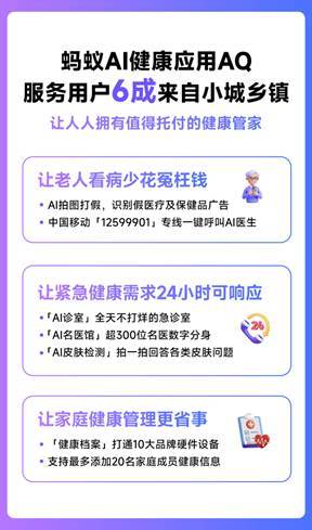 据了解,伴随AQ持续升级,AI诊室、健康档案、打假辟谣已成为该产品的三大差异化特色,覆盖了急症、慢病以及老年等群体需求,“无论是边远农村还是一线城市,我们希望给中国每个家庭都配上一个‘健康管家’,永远在线,第一时间响应每个人的健康需求”。蚂蚁AI医疗总经理刘军伟介绍,