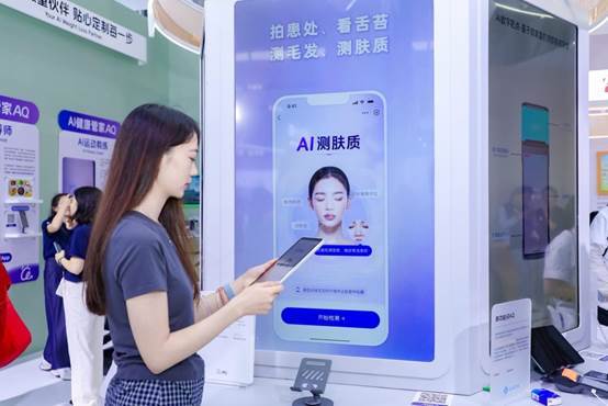 “AI智能皮肤检测”也成为今年外滩大会展区的亮点。结合大模型多模态能力,AQ可识别超50余种皮肤疾病。使用AQ拍舌苔可测中医体质,拍毛发可检测是否有脱发风险,拍全脸可得到详细的肤质检测报告及健康护理建议。