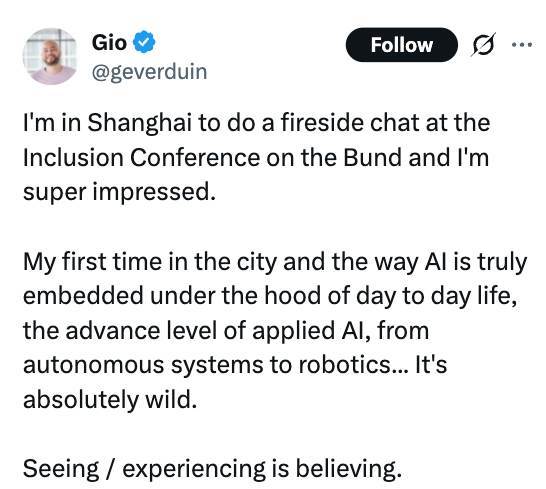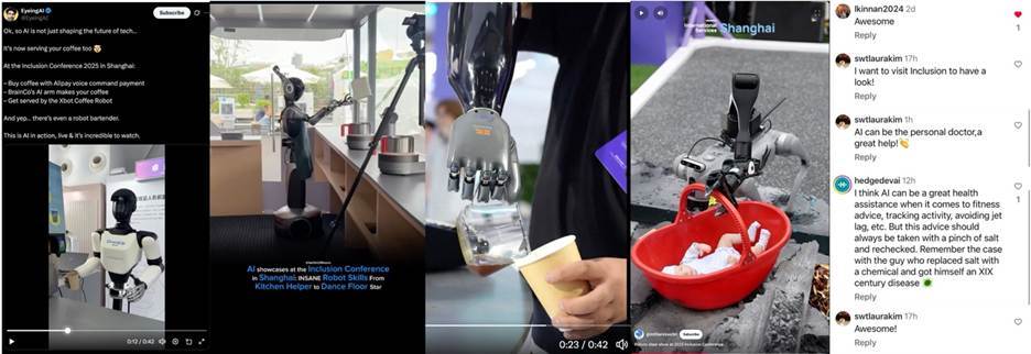 【环球网科技综合报道】“我必须去中国亲眼看看!”……近日,在YouTube、X(原Twitter)Instagram等海外主流社交平台上,一股源自上海外滩的“AI热潮”正在迅速蔓延。众多海外科技博主、媒体和普通网友纷纷转发来自2025 Inclusion·外滩大会的视频片段,从机器人在废墟中救出婴儿,到一杯语音即可购买的咖啡,中国AI在日常生活中的真实应用,正以前所未有的“酷炫”姿态,成为全球舆论场的“顶流”话题。